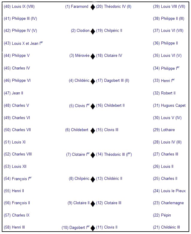 - Les Valois (1328-1589) : Jean II le Bon (1350-1364) ; Charles V le Sage (1364-1380) ; Charles VI le Fol ou le Bien-Aimé (1380-1422) ; Charles VII le Victorieux (1422-1461) ; Louis XI (1461-1483) ; Charles VIII (1483-1498) ; Louis XII (1498-1515) ; François Ier (1515-1547) et la vénalité des charges ; Henri II (1547-1559) ; François II (1559-1560) ; Charles IX (1560-1574) ; Henri III (1574-1589) et le Pont-Neuf