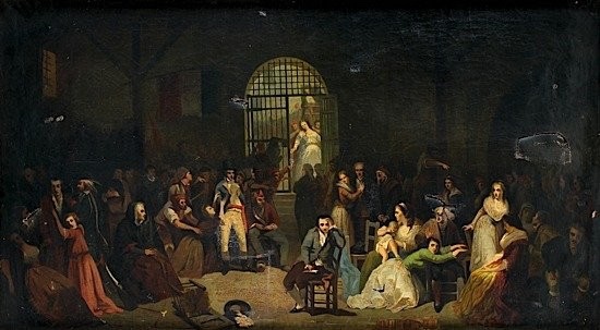 Robespierre, blessé par balle au visage et gisant sur un brancard, rejoint ses compagnons à la Conciergerie emprisonnés dans la nuit ou en début de matinée.