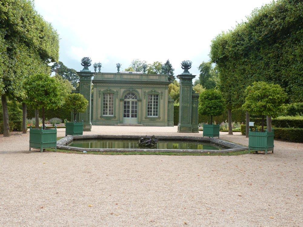 Le Pavillon frais représente, en 1753, l’achèvement de la première partie de l’œuvre de Gabriel au Petit Trianon, avant que le domaine ne soit livré aux jardiniers et botanistes. Il est situé à l’extrémité de la branche sud de la croix latine formant le Jardin français. A l’opposé se situe la ménagerie. L’allée faisant face au Salon frais qui mène au Pavillon français est de même largeur, afin de préserver la vue entre les deux édifices. A l’avant du salon se trouve un jardin rectangulaire, de cinquante mètres par vingt, véritable « cabinet de verdure » entièrement entouré d’arcades de treillage. Celles-ci, alignées sur la façade nord de l’édifice, sont constituées d’une série d’armatures de fer de près de 3,50 m de hauteur sur 2,35 m de largeur, exécutées par le serrurier Gamain le Jeune en juillet 1752. Ces armatures supportent des pilastres en treillage enserrant le tronc de tilleuls au feuillage taillé en boule. L’entrée est encadrée de deux imposants piliers supportant de grandes corbeilles. Les allées sont couvertes de sable de rivière.