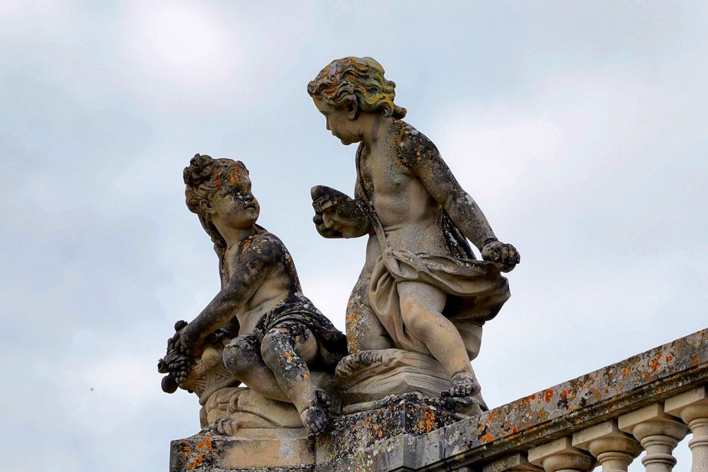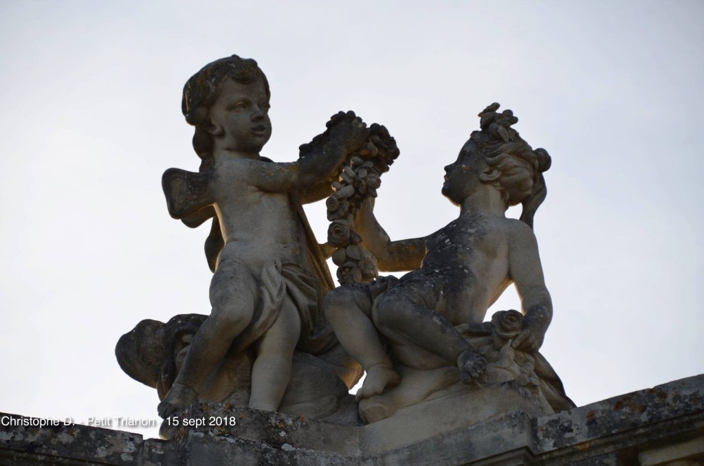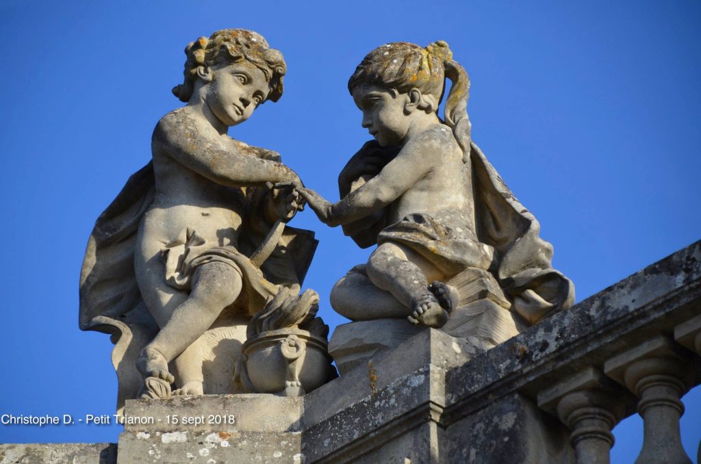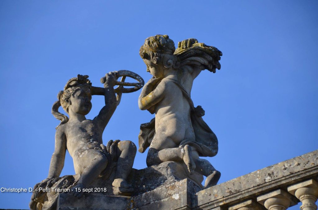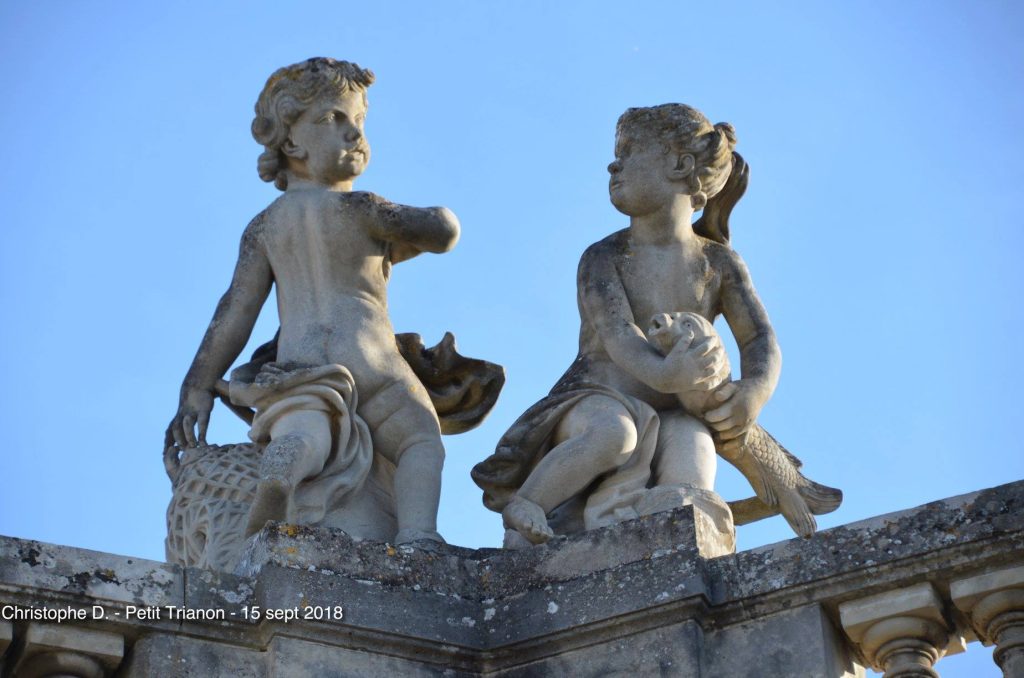Sur la balustrade du Pavillon Français, des statuettes d’enfants alternant avec des vases de fleurs sont l’œuvre de Jules-Antoine Rousseau, sculpteur des bâtiments du Roi. Ces huit groupes sont disposés à l’aplomb de chacun des angles rentrants de la façade. Ils représentent les quatre saisons et les quatre éléments, mesurent environ un mètre et demi et sont composés en ronde-bosse de pierre de Saint-Leu.
