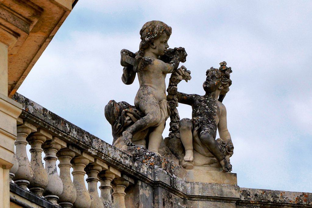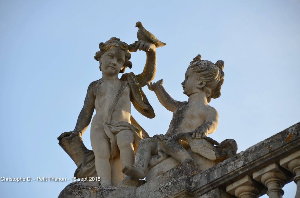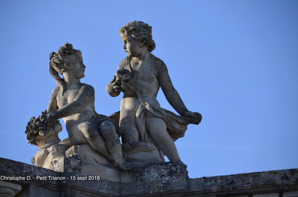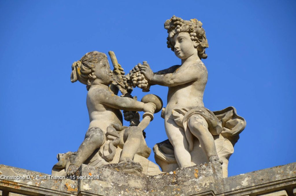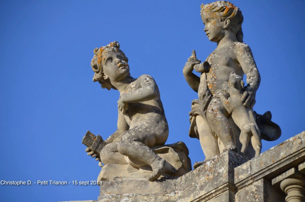 Sur la balustrade du Pavillon Français, des statuettes d’enfants alternant avec des vases de fleurs sont l’œuvre de Jules-Antoine Rousseau, sculpteur des bâtiments du Roi. Ces huit groupes sont disposés à l’aplomb de chacun des angles rentrants de la façade. Ils représentent les quatre saisons et les quatre éléments, mesurent environ un mètre et demi et sont composés en ronde-bosse de pierre de Saint-Leu.