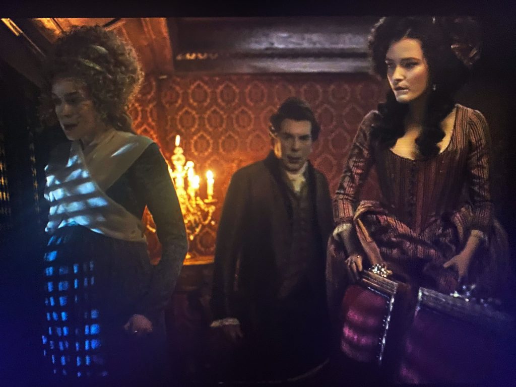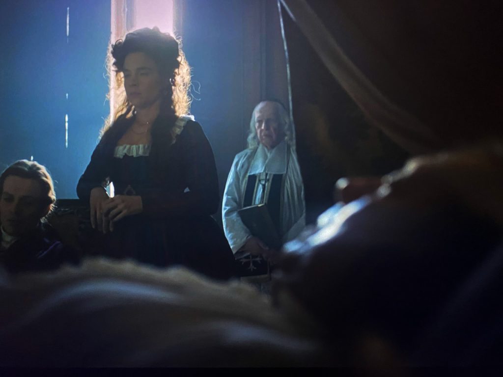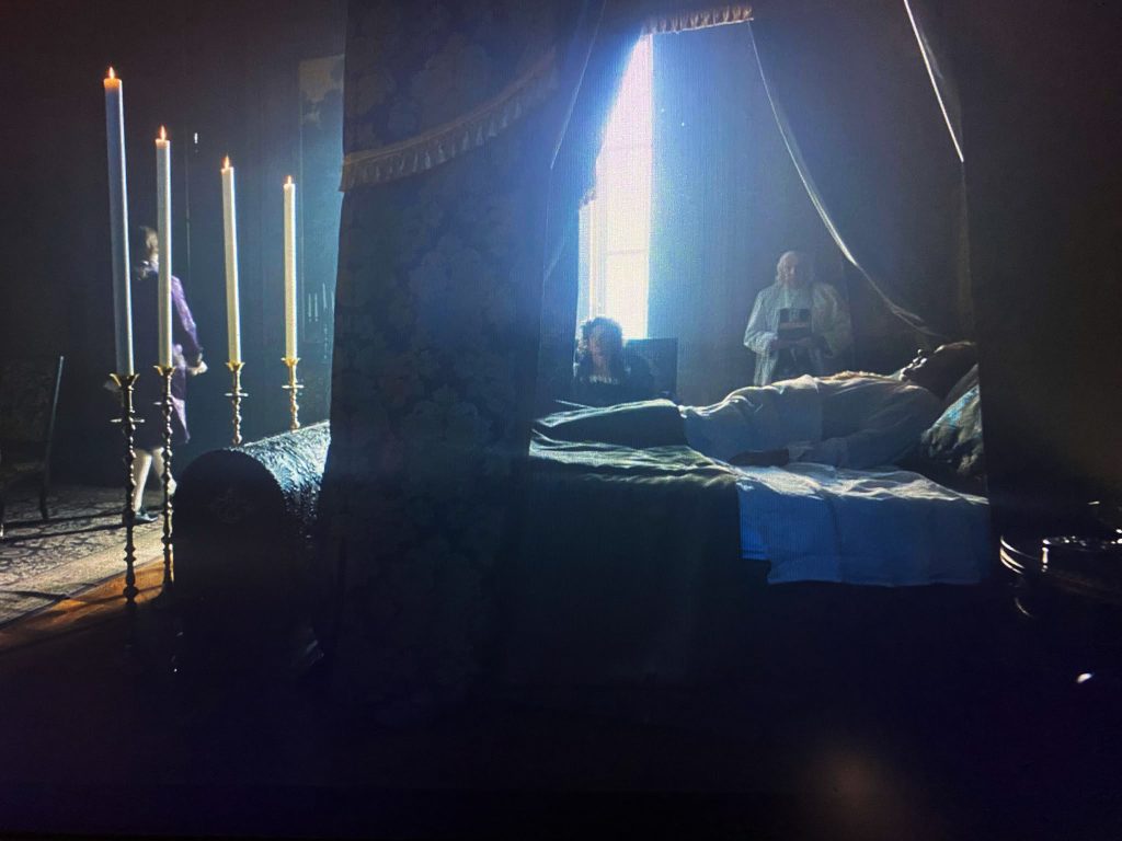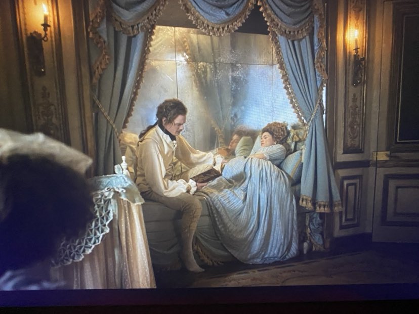 25’26 : Toujours dans ce lit abominable qui provoquerait les pires cauchemars à n’importe qui, la princesse de Lamballe et la comtesse de Noailles bordent Marie-Antoinette de manière extrêmement rigoureuse. Certainement pour le gage de sa vertu. Une Cour de France correctement rendue aurait évité une telle ficelle scénaristique complètement absurde. D’ailleurs la princesse de Lamballe n’a pas encore à gérer la Chambre de la Dauphine. Elle n’est ni première princesse du sang (c’est alors sa belle-soeur la duchesse de Chartres inexistante ici), ni surintendante de sa Maison.