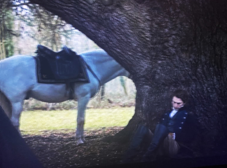 22’18 : Nouvelle traversée d’une forêt broussailleuse censée montrer le voyage entre Compiègne et Versailles. Avec étape (oubliée !) à La Muette à l’ouest de Paris. C’est pathétique de voir aussi peu de moyens techniques. Louis XV seul en voiture avec le Dauphin lui demande ses impressions sur sa future épouse. Celui-ci répond en la comparant à une pouliche ! On veut nous faire croire que le futur Louis XVI vouait une passion démesurée aux chevaux, a priori pour lui plus intéressants que les êtres humains. Alors certes il aimait beaucoup l’équitation, mais pas plus que son grand-père ou n’importe quel autre Bourbon. Jamais on l’a vu comparé des personnes, encore moins sa femme, à des équidés !