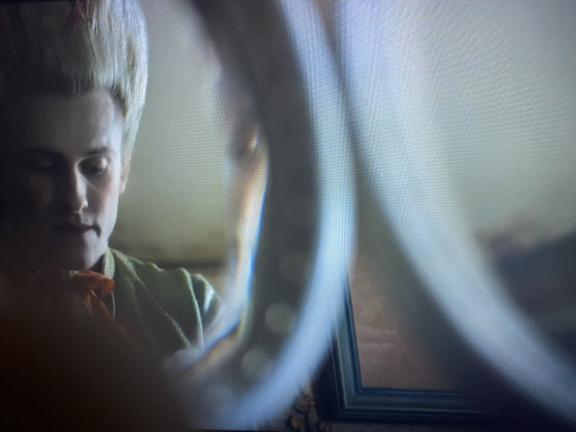 On révèle au cardinal de Roha n que l’oeuvre de charité de Jeanne est fictive. L’avocat (qui ressemble à Gérald Darmanin) lui dzmontre son imbécilité. Félicité vient proposer son aide à Cagliostro en prison, en échange de l’appui de la franc-maçonnerie. Les Provence invitent le Roi à aller admirer ce qui ressemble à une éclipse de lune …. il est seul dans les jardins de Fontainebleau, mais cela semble à vouloir le faire passer pour lunative et même fou. Il cherche toujours à interdire son frère pour s’emparer de la régence. C’est, cette fois, avec Roi George III d’Angleterre que les scénaristes mélangent le Roi de France. Mode Bridgerton oblige !