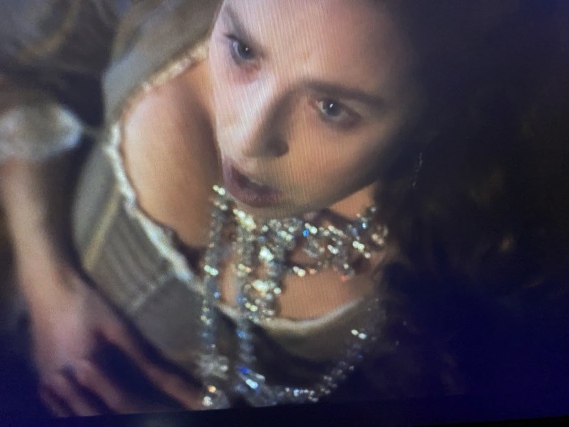 Une fois parties, Marie-Antoinette se libère de ses draps et découvre une vieille boîte à bijoux, tout à fait dans le style gothique XIXème siècle du reste de la chambre. Elle l’ouvre et y prend un collier de perles (moche, il faut le faire !), se moque des révérences qui lui ont été imposées toute la journée et aperçoit alors un message lui disant de se méfier de tout le monde à Versailles et que les murs ont des oreilles. Et là elle entend des chuchotements venus de partout, nous plongeant une fois de plus dans cette atmosphère de film d’horreur raté. On la voit alors rêver se noyer à cause du collier décuplé. Est-ce une métaphore du fameux collier qui n’apparaîtra dans sa vie que quinze ans plus tard ?